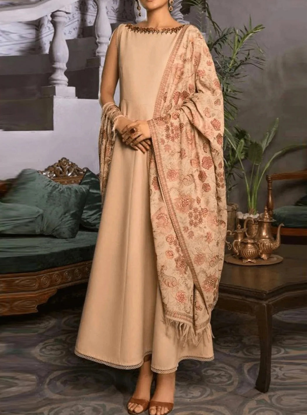 Sarinnah D77-Embroidered Karandi Beige Shawl
