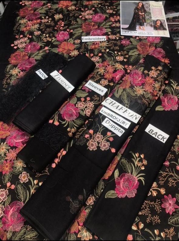 Grace S228-Embroided 3pc linen dress with embroidered chiffon dupatta.